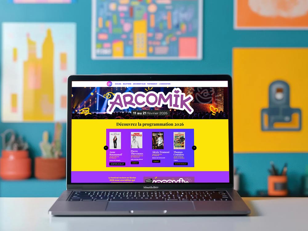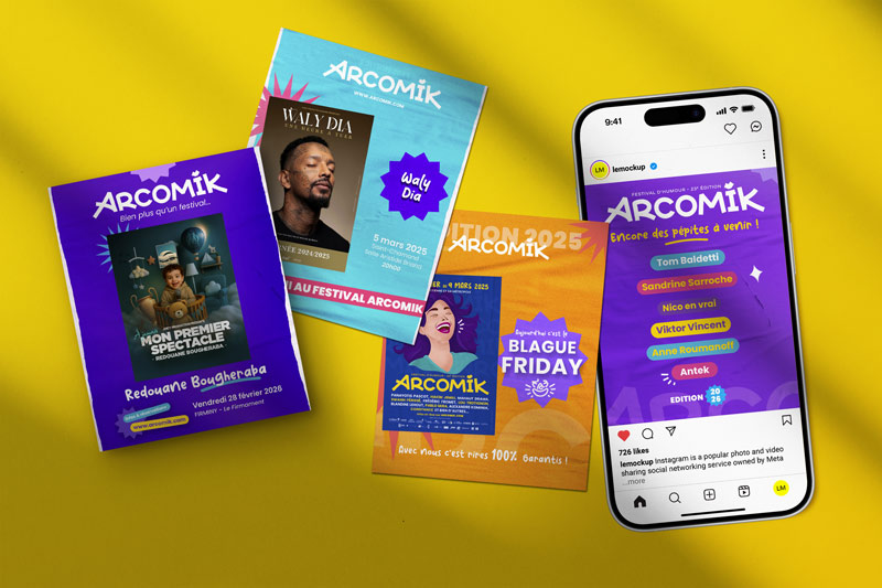 Depuis 3 éditions, j’accompagne Arcomik, festival d’humour à Saint-Étienne, sur toute sa communication visuelle.